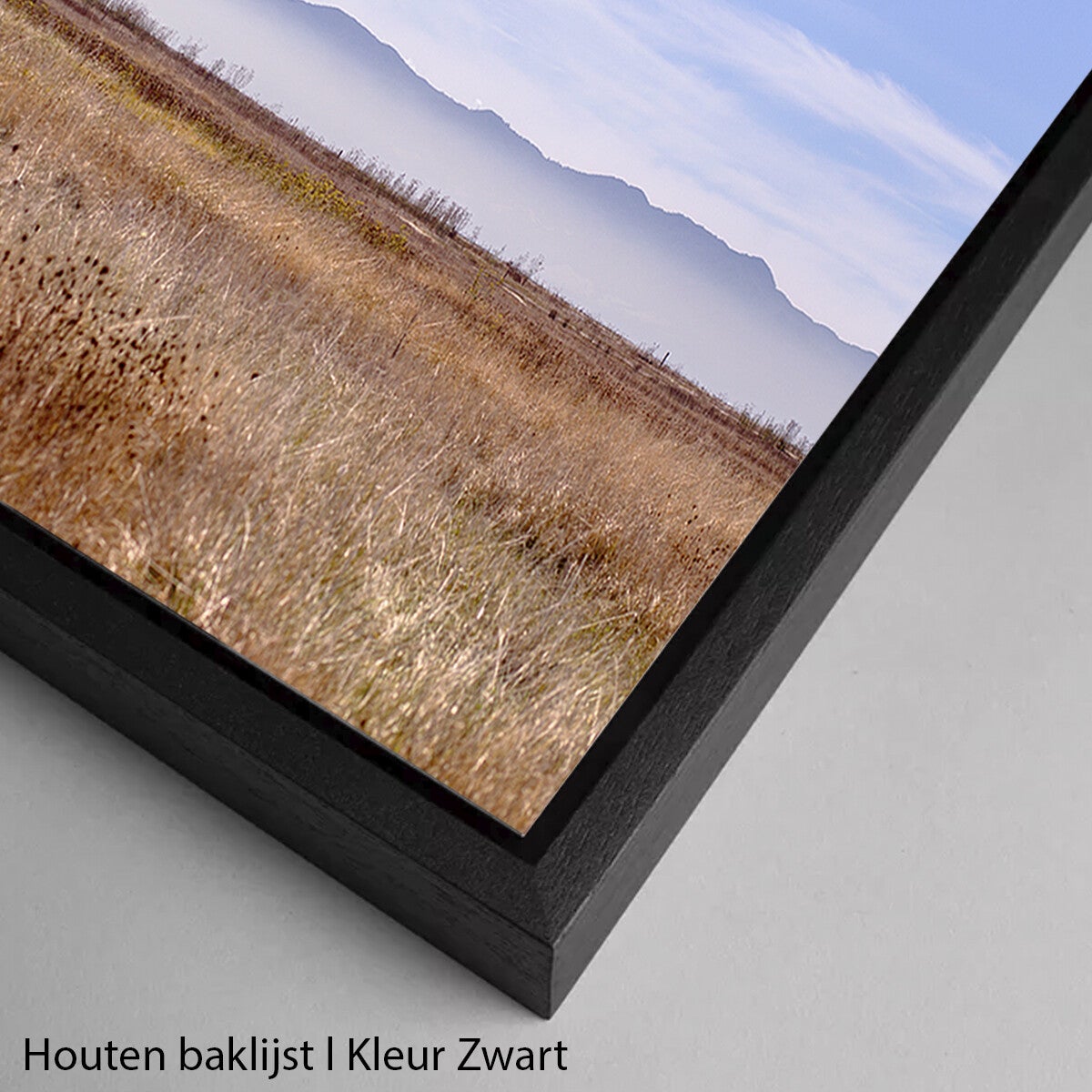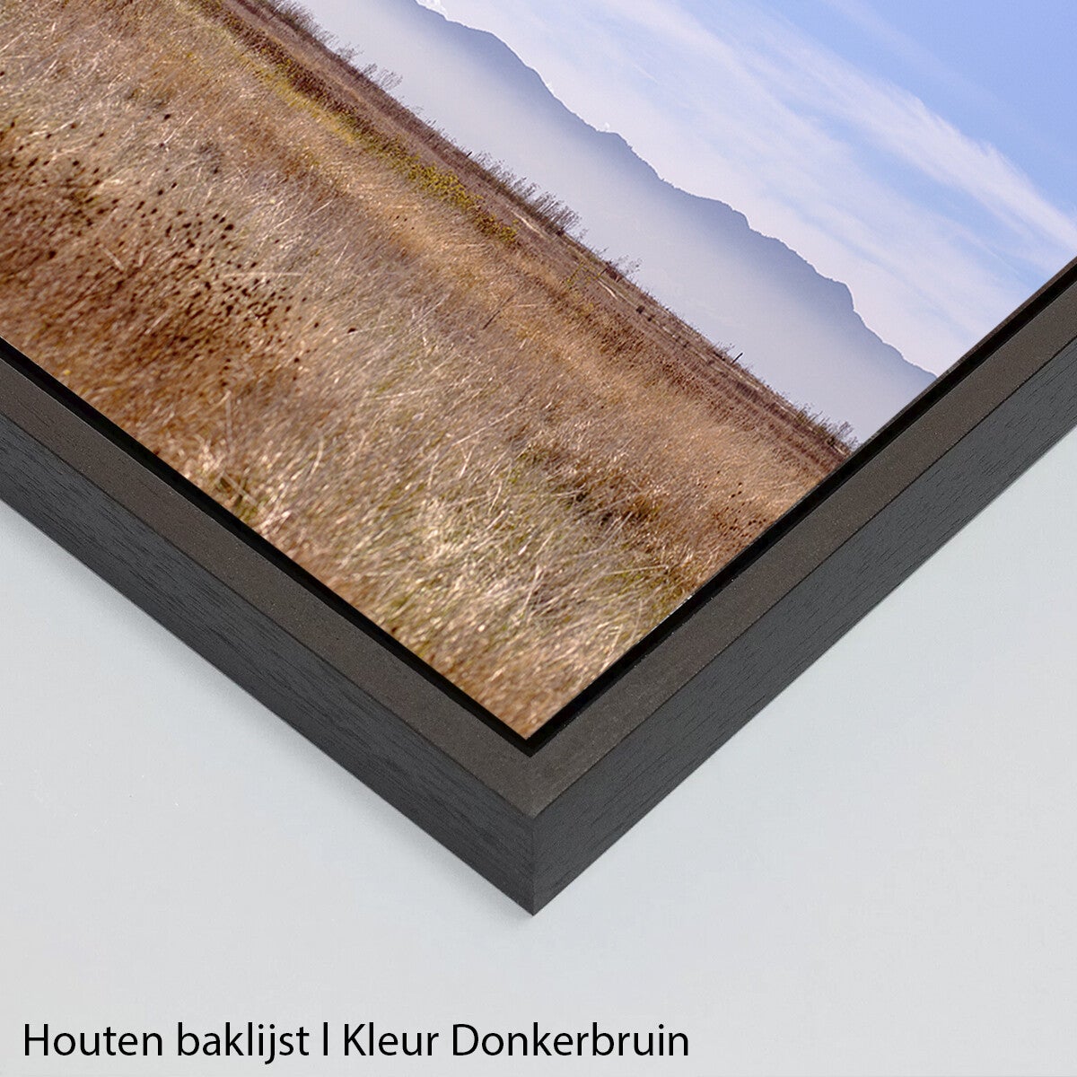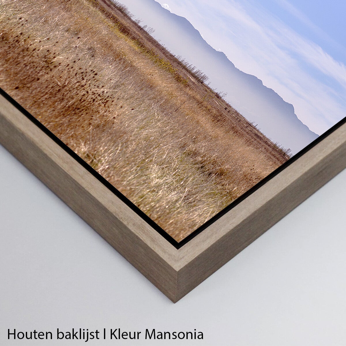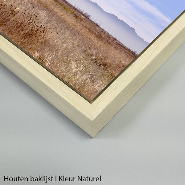 • Hahnemühle Fine Art print in houten baklijst l keuze uit de kleuren wit, naturel, mansonia, donkerbruin en zwart.